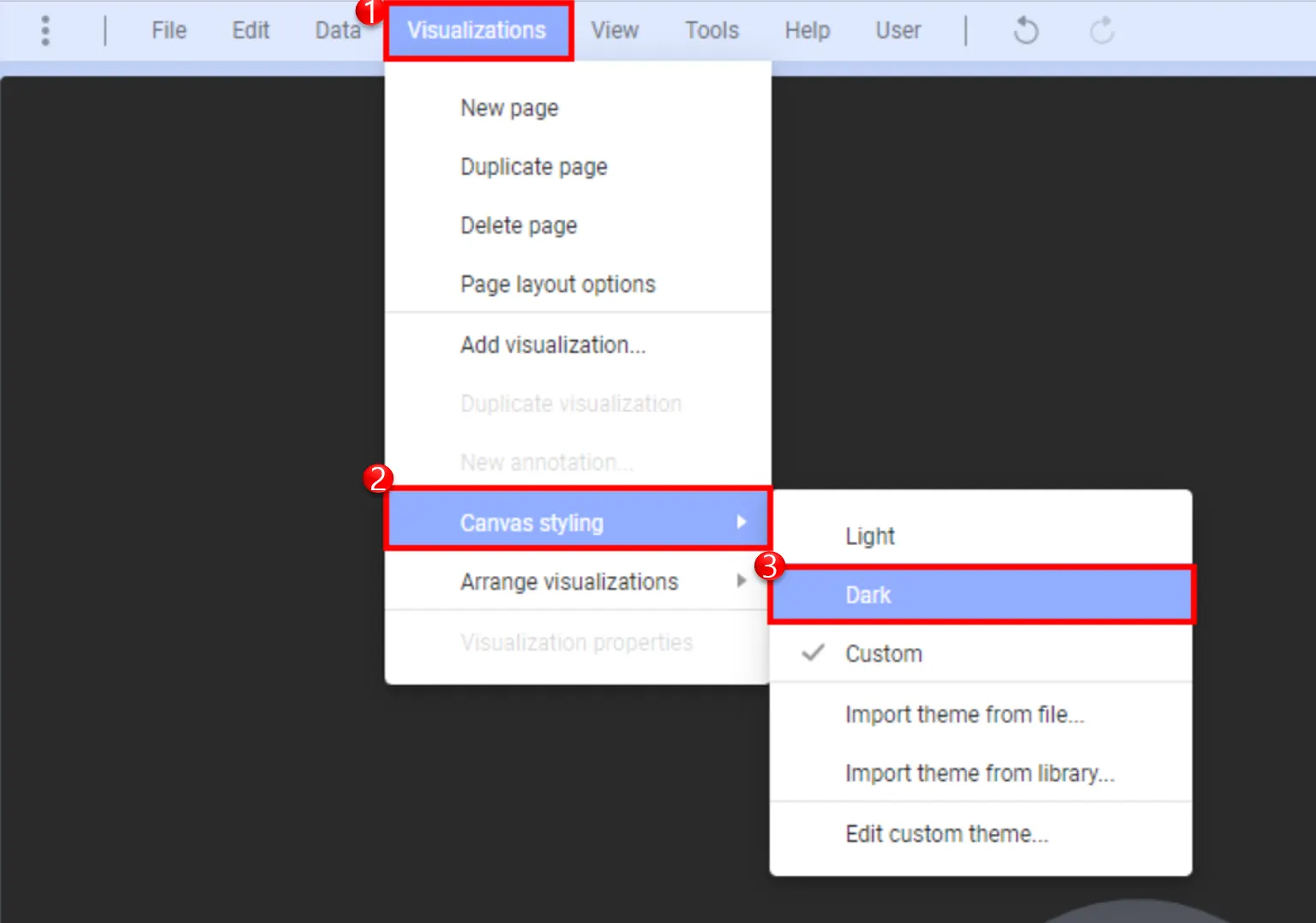 [메뉴 / 시각화] → [캔버스 스타일 지정] → [밝게/어둡게]