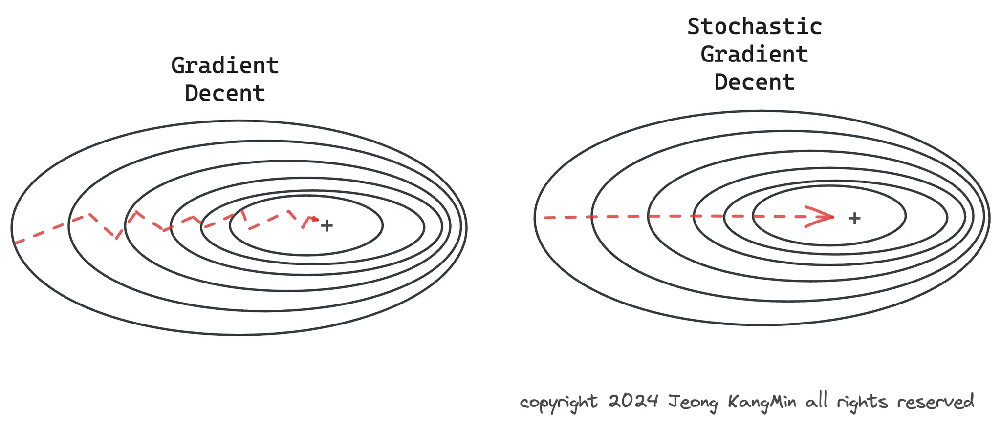 즉, 모델 업데이트를 위해 전체 데이터셋에 대한 비용 함수의 그라디언트를 한 번에 계산합니다.